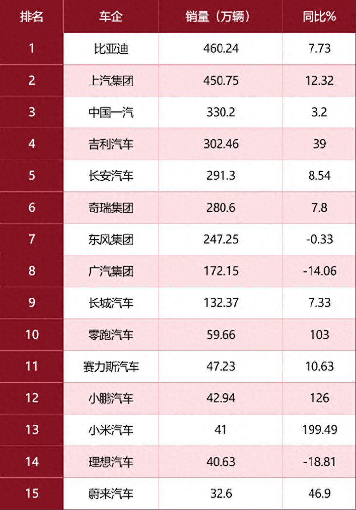 在乘联会发布的这份榜单中,虽然比亚迪依然以348.5万辆的成绩遥遥领先,但是同比6.3%的下滑却给其敲响了警钟。而排名第二的吉利汽车的同比增速高达46.9%,后来居上的态势不容小觑。众所周知,全面对标比亚迪王朝/海洋系列的吉利旗下的银河成为销量增长的最大动力来源,其凭借相较于比亚迪更高的性价比对后者构成了极大的威胁。当然,比亚迪肯定不愿意让出销冠宝座,除了在方程豹、腾势等中高端品牌寻求更大突破外,还打造了领汇,希望能够寻找一个全新的细分市场,来为销量的持续增长蓄力。