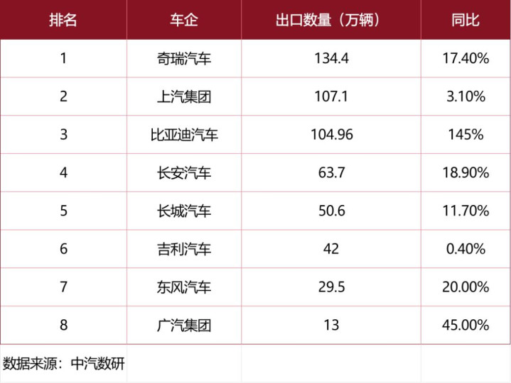 根据中汽数研披露的数据,奇瑞汽车依然以134.4万辆加冕起初出口冠军的头衔。而奇瑞、上汽和比亚迪成为唯三销量突破100万的车企,组成了国内车企出口的第一集团。但需要指出的是,比亚迪高达145%的增速远远快于奇瑞和上汽,考虑到其过去两年在海外市场投入的大量资源和布局的渠道,其很有可能在2026年超过挑战奇瑞,成为新科出口冠军。
