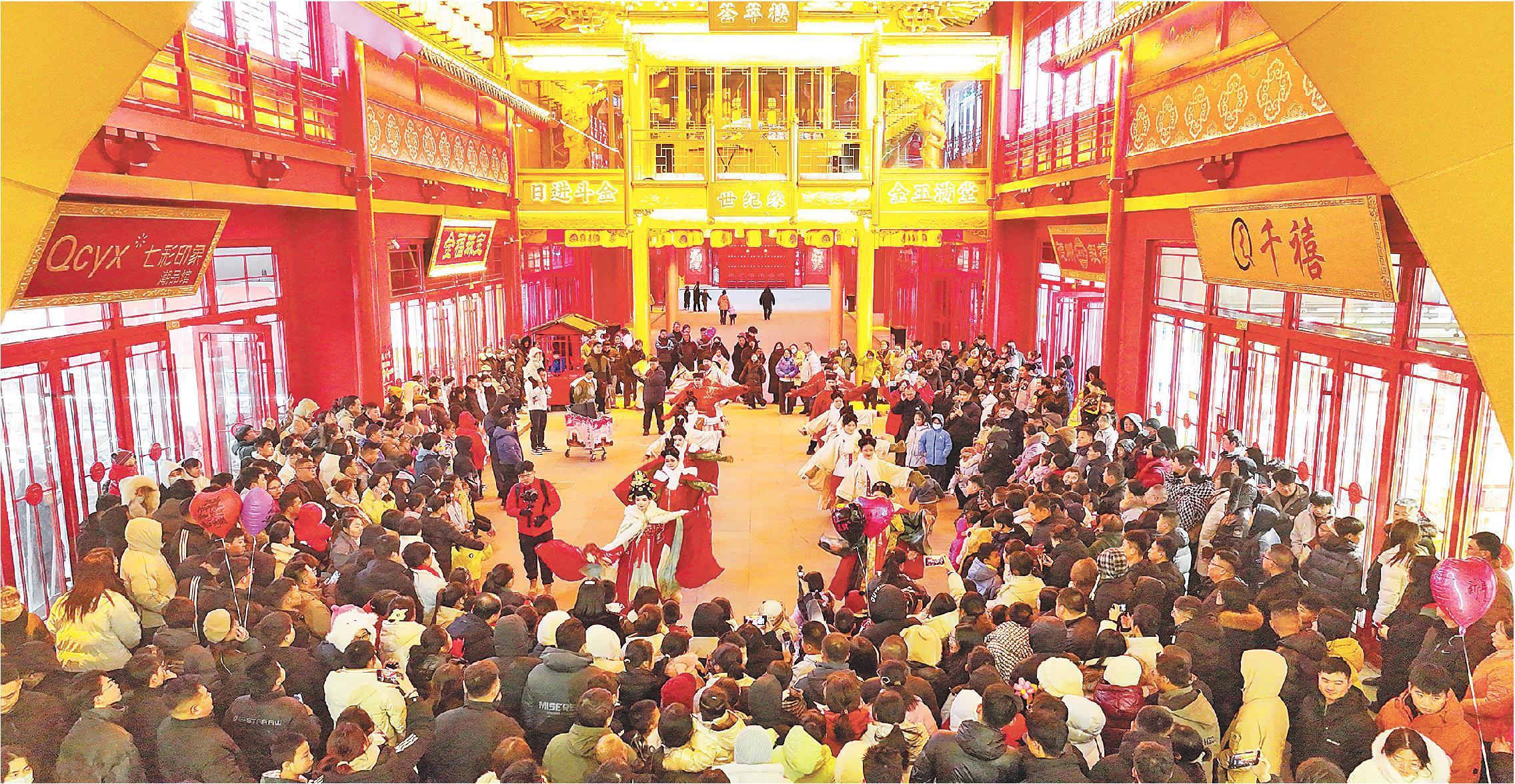 以德州建制起始之年(公元589年)命名的德百奥莱589街区,正成为城市文旅融合的鲜活案例。1月28日,记者在街区内看到,行进式沉浸巡游剧《德州双魁耀古今》正加紧排练,备战春节档。该剧讲述了唐代德州第一位文状元孙伏伽和清代德州唯一武状元昌伊苏的传奇故事。自去年7月开街以来,德百奥莱589街区单日最高接待游客超5万人次。天衢新区推动街区、海洋馆、冰雪王国、西藏馆、新疆馆等升级改造,融合德州历史、边疆风情、民俗美食、海底观光、冰雪世界于一体,将国际名品折扣零售与创新场景、生活体验深度链接,提供全天候、一站式高品质消费。