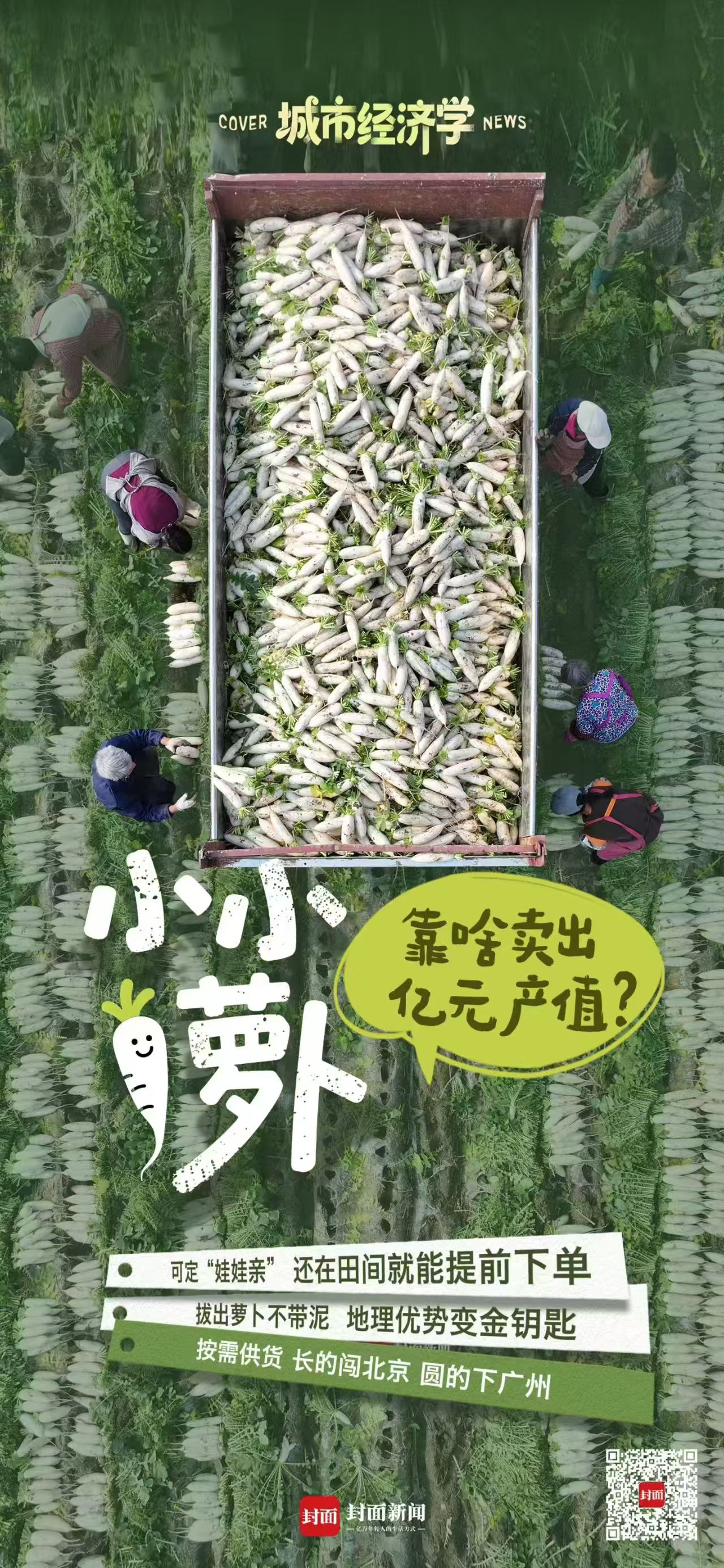1月17日,湖北经销商徐先生又一次来到红江镇,在地头监督工人打包萝卜。长短均匀的白萝卜被装袋码齐,静待装车。48小时后,这批萝卜将出现在广东的菜市场。